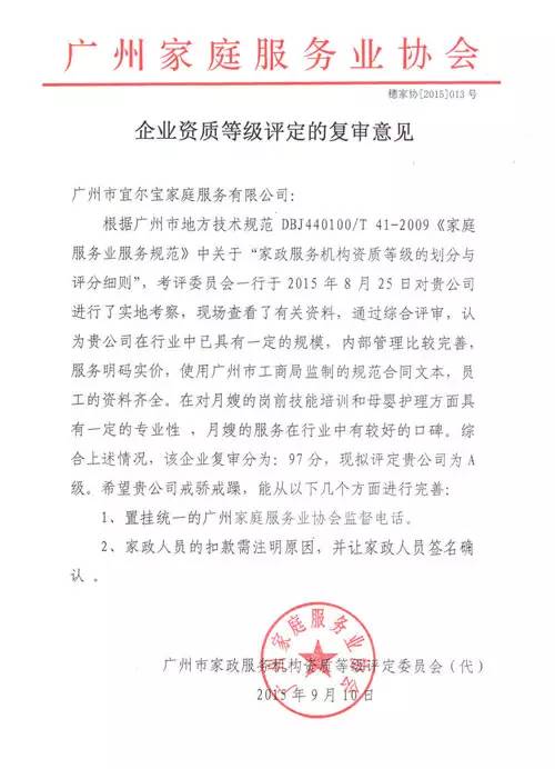 根據廣州市地方技術規范DBJ440100/T 41-2009《家庭服務業服務規范》中關于“家政服務機構資質等級的劃分與評分細則”,考評委員會一行于2015年8月25日對宜爾寶月嫂公司進行了實地考察,現場查看了相關資料,通過綜合評審,認為宜爾寶月嫂公司在行業中已具有一定的規模,內部管理比較完善,服務明碼實價,使用廣州市工商局監制的規范合同文本,員工的資料齊全。在對月嫂的崗前技能培訓和母嬰護理方面具有一定的專業性,月嫂的服務在行業中有較好的口碑,因此宜爾寶榮獲《A級企業單位》稱號。